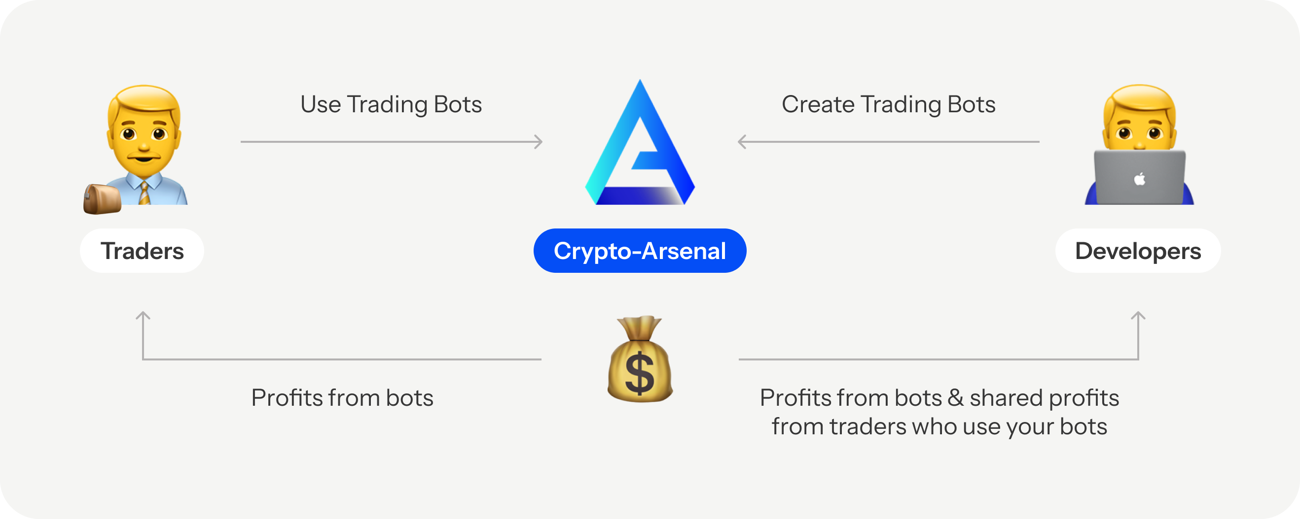 Crypto-Arsenal’s model definitely creates value for both sides of users and for the company itself. However, since the strategies are not 100% automated, and often need fine-tuning by trader themselves.
