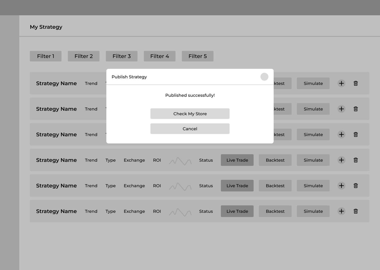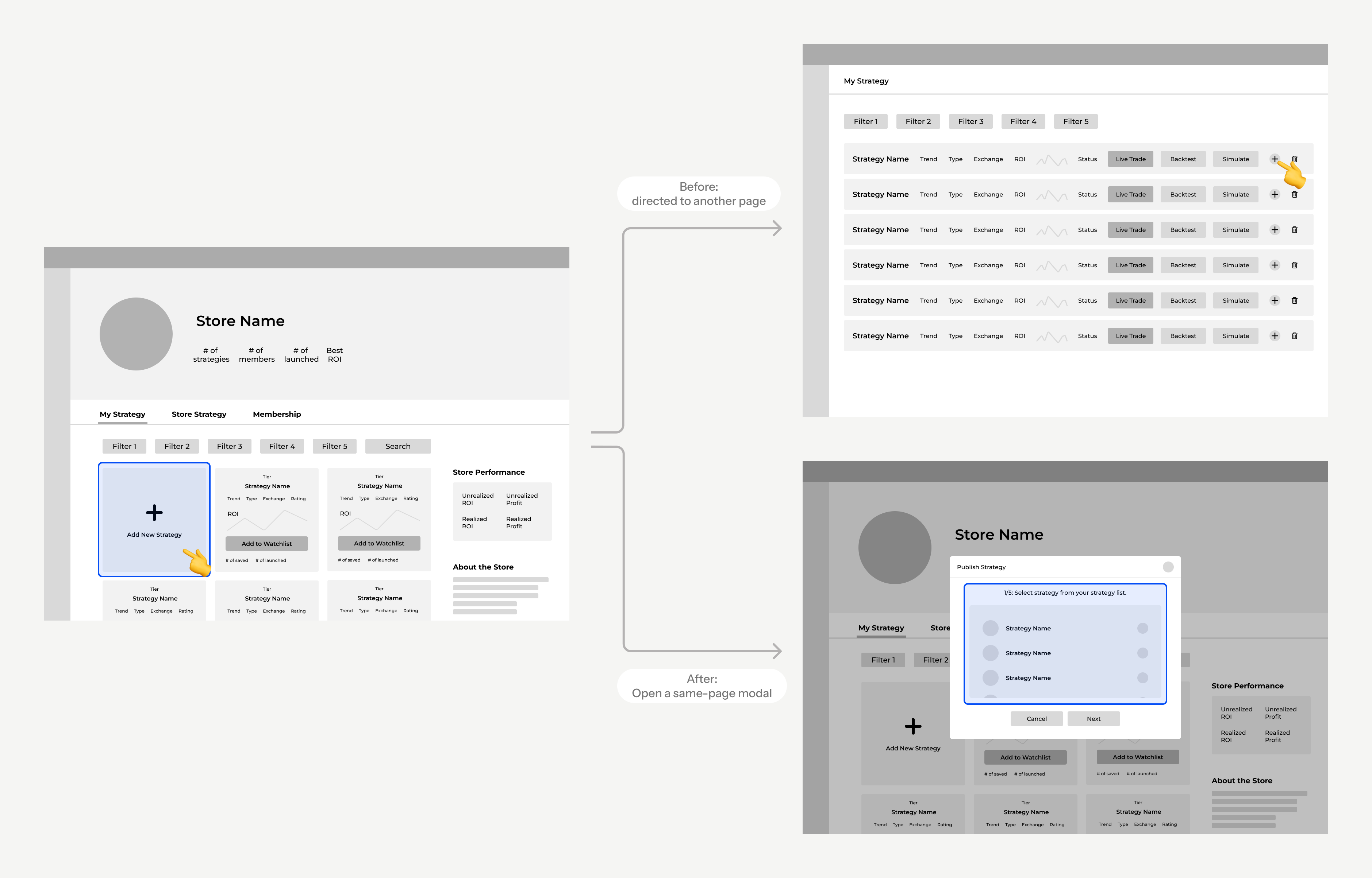 In the original flow, when users wanted to publish a strategy to the store, they had to first navigate to a separate page that listed all of their strategies and then select the one they wanted to publish.
