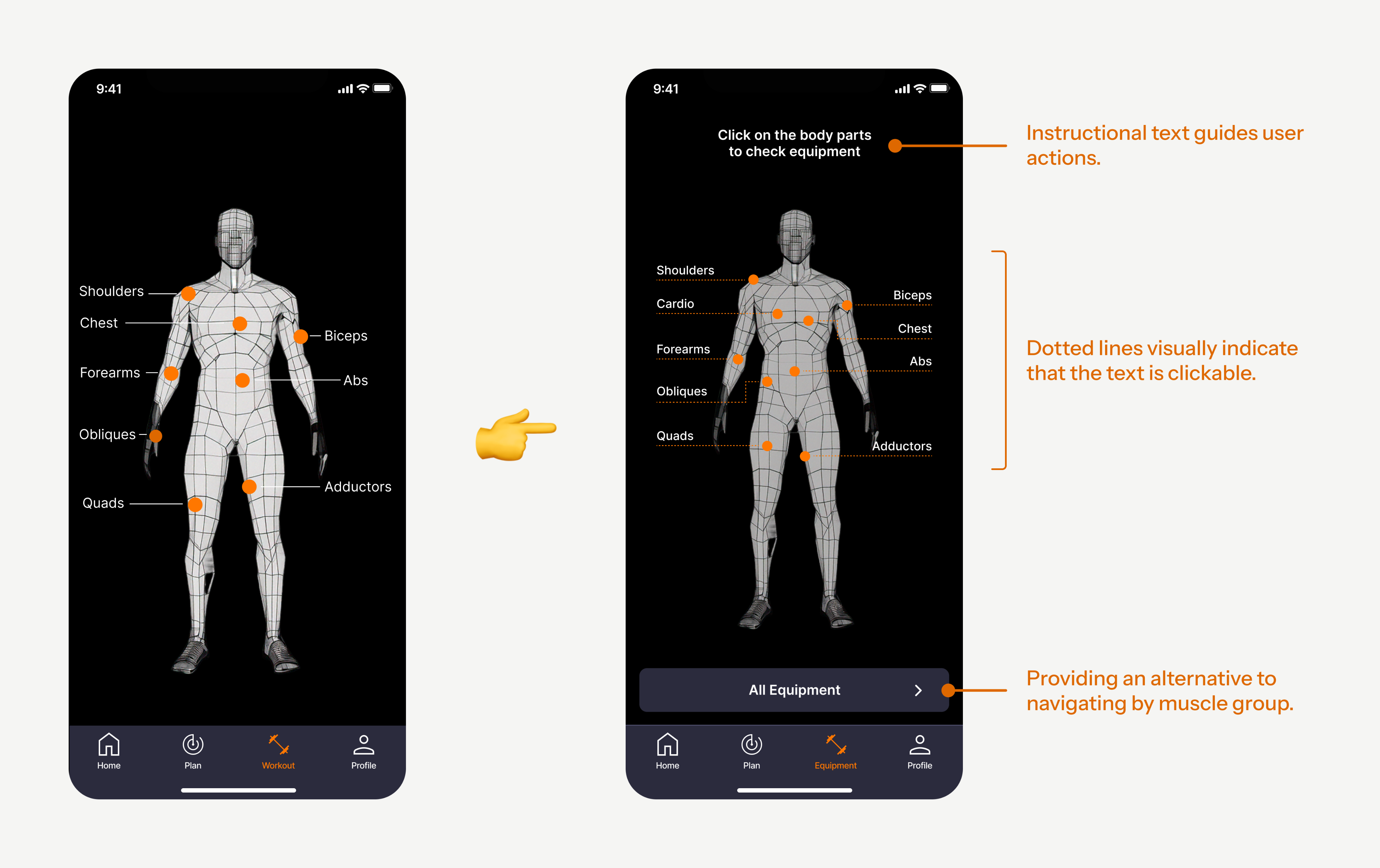 Provides an intuitive way for users to identify and select target muscles, helping them look for the appropriate equipment.