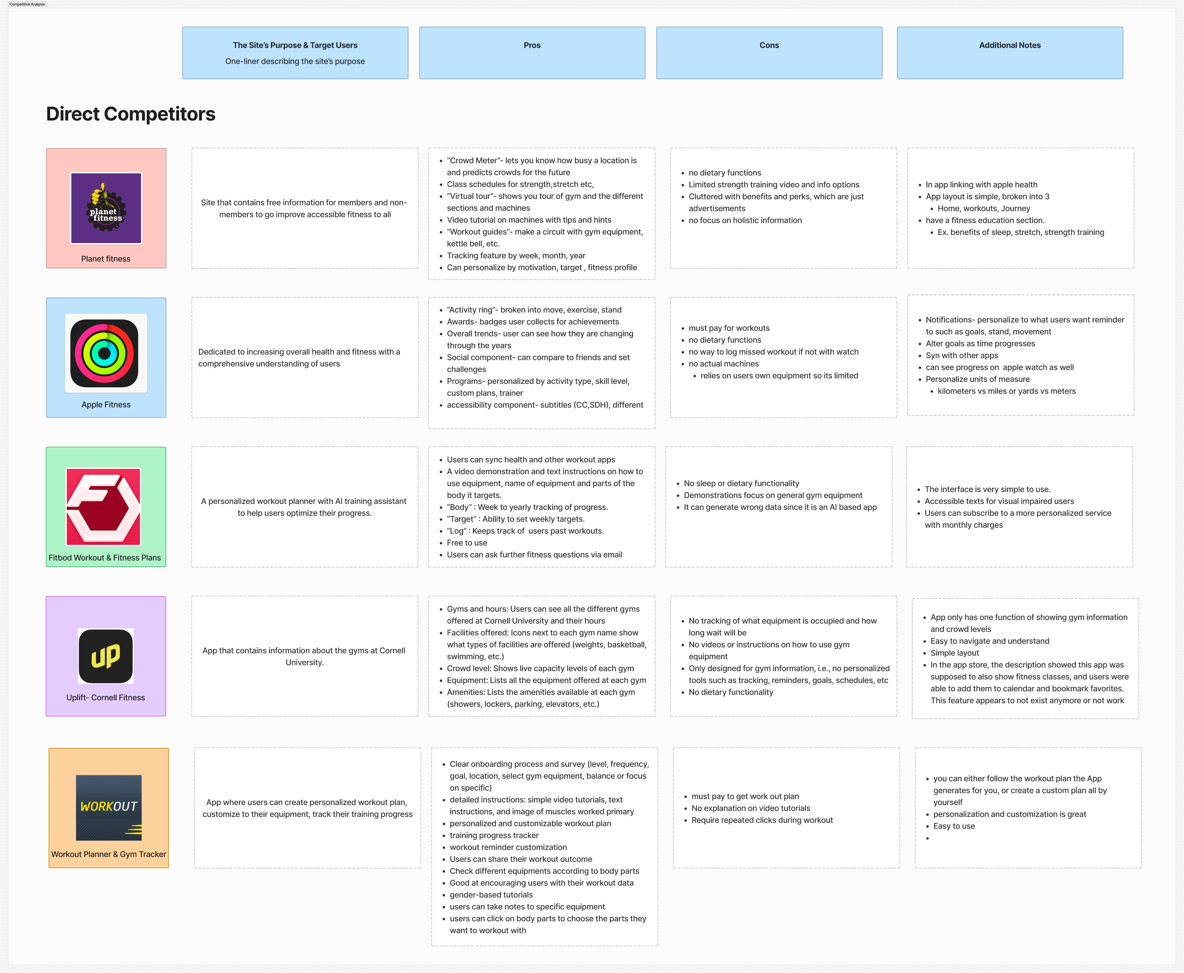 To identify the key features to include in our App, we categorized all the information from survey with an affinity diagram and got a comprehensive understanding of the current landscape of workout Apps with competitive analysis.
